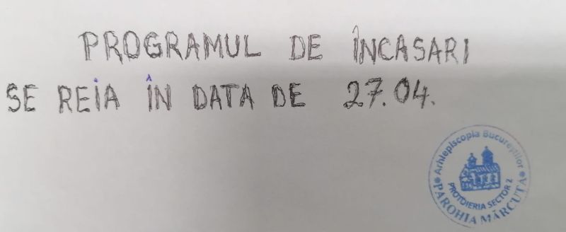 Parohia Mărcuța, aflată pe strada Mărcuța nr. 34, din cadrul Protoieriei Sector 2 Capitală, anunță că programul pentru încasări se reia în data de 27.04.2026.